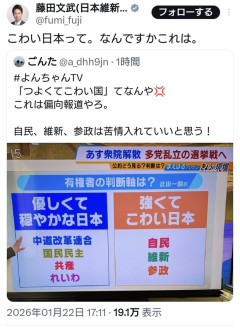 1:2026/01/23(金) 17:31:40.56 ID:CkEuSDtK0.net衆議院は23日午後の本会議で解散され、事実上の選挙戦へ突入する。各党が有権者へのアピールを強める中、公示を前にして関西の準キー局である毎日放送(MBS)が放送した「政党分類」が、あまりに偏向しているとしてネット上で大炎上している。特定の政党を「周りから怖いと思われる日本」を目指す勢力と定義づけた解説に対し、当事者である政党代表らが激怒。番組内で謝罪が行われたものの、ネット上では放送法に抵触するのではないかとの疑念の声が止まない事態となっている。(省略)全文 転載元スレッド:…