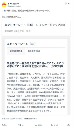 1: 2026/01/23(金) 21:06:25.53 これは夜の王者、慶応生の伝説のエントリーシート。まじで意味わからん。 pic.twitter.com/m4CVM6spLd— おすし就活 (@system_system_) May 20, 2024 ※関連記事 慶応義塾幼稚舎に進学したタレント、『なんで勉強を競わないといけないんだろう』と親の七光りで芸能界に逃げた結果………