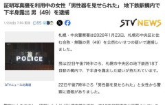 1 : 札幌・中央警察署は2026年1月23日、札幌市中央区に住む自称・無職の男(49)を公然わいせつの疑いで逮捕しました。 22日午後7時半ごろ「男性器を見せられた」と女性から警察に通報がありました。 警察によりますと、通報した女性が札幌市営地下鉄・西18丁目駅構内に設置されている証明写真機を利用中、突然、男が下半身を見せてきたということです。 その後、男は女性に気づかれ逃走したため、女性らが男を追いかけましたが駆け付けた警察官が男の身柄を確保したということです。 調べに対し男は「弁解することは特にありません」と容疑を認めています。…