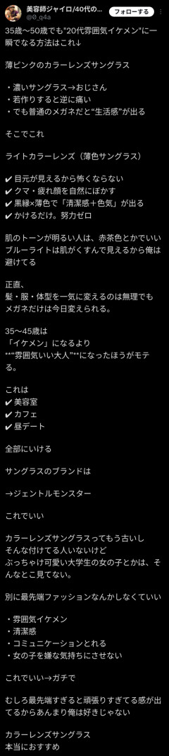 1: 2026/01/24(土) 17:40:45.36 35歳〜50歳でも"20代雰囲気イケメン"に一瞬でなる方法はこれ↓ 薄ピンクのカラーレンズサングラス… pic.twitter.com/sJJhOdnILu— 美容師ジャイロ/40代の外見改善 (@0_q4a) January 23, 2026 ※関連記事 【画像】この漫画の「ダメ人間」と付き合っている彼女の話、少し怖くて草wwwww…