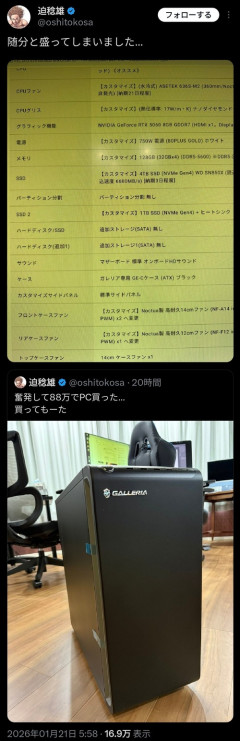 1: 2026/01/24(土) 19:49:45.07 随分と盛ってしまいました… pic.twitter.com/GwC7spZnpA— 迫稔雄 (@oshitokosa) January 20, 2026 ※関連記事 パソコン価格、年明けには6倍になる見通し、すでにメモリ単品は「16GBで約5万円」…