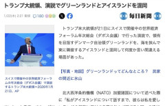 1 : トランプ米大統領が21日にスイスで開催中の世界経済フォーラム年次総会(ダボス会議)で行った演説で、領有を目指すデンマーク自治領グリーンランドを、海を挟んで東に隣接するアイスランドと混同して何度か言い間違える場面があった。 北大西洋条約機構(NATO)加盟諸国について述べた際に「私がアイスランドについて話すまで、彼らは私を愛していた」と発言。また、グリーンランドの領有に反対する英仏独など欧州8カ国への追加関税を表明したことを発端に株価が下落したことに触れ、「アイスランドのせいで株価が昨日急落した。アイスランドは既に我々に多額の損失を与えている」と語った。 トランプ氏は20日にホワイトハウスで行った記者会見でも、政権が実施してきた各国への高関税措置について言及する中で、「関税がなければ(欧州諸国)はアイスランドについて我々と話さなかっただろう」と話していた。…