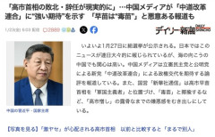 1 : 「高市首相の敗北・辞任が現実的に」…中国メディアが「中道改革連合」に“強い期待”を示す「早苗は“毒苗”」と悪意ある報道も いよいよ1月27日に総選挙が公示される。日本ではこのニュースが連日大々的に報じられているが、海の向こうの中国でも関心は高い。 中国メディアは立憲民主党と公明党による新党「中道改革連合」による政権交代を期待する論評を報道している。また、国営「新華社通信」は高市早苗首相を「軍国主義者」と位置づけ、「毒苗」と揶揄するなど、「高市憎し」の露骨なまでの嫌悪感をむき出しにしている。…