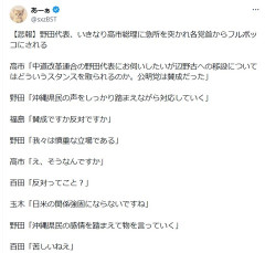 1:それでも動く名無し:2026/01/25(日) 09:28:53.39 ID:9hzqOjoD0 福島「(辺野古移設)賛成ですか反対ですか」 野田「我々は慎重な立場である」 高市「え、そうなんですか」 百田「反対ってこと?」 玉木「日米の関係強固にならないですね」 野田「沖縄県民の感情を踏まえて物を言っていく」 百田「苦しいねえ」 2:それでも動く名無し:2026/01/25(日) 09:29:07.78 ID:9hzqOjoD0 まあそらそうや 3:それでも動く名無し:2026/01/25(日) 09:29:54.90 ID:dAxvJTFv0 いくら合体したとはいえ従来のメイン主張360度回転はあかんやろ…