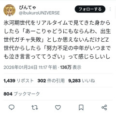 1: 2026/01/25(日) 10:53:34.78 氷河期世代をリアルタイムで見てきた身からしたら「あーこりゃどうにもならんわ、出生世代ガチャ失敗」としか思えないんだけどZ世代からしたら「努力不足の中年がいつまでも泣き言言っててうざい」って感じらしいし— ぴんてゃ (@ibukuroUNIVERSE) January 24, 2026 ※関連記事 【画像】この漫画の「ダメ人間」と付き合っている彼女の話、少し怖くて草wwwww…