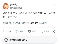 引用元: 569: Vtuberまとめ2026/01/25(日) 16:31:09.42 3.4万良いねは草 みこち嫌われ過ぎだろ 578: Vtuberまとめ2026/01/25(日) 16:31:28.87 >>569 これは随分辛口だ 583: Vtuberまとめ2026/01/25(日) 16:31:37.56 >>569 あっちゅあっちゅ 588: Vtuberまとめ2026/01/25(日) 16:31:52.09 >>569 消せ 591: Vtuberまとめ2026/01/25(日) 16:32:01.40 >>569 少なくとも ココ、メル、かなたは違う 593: Vtuberまとめ2026/01/25(日) 16:32:06.76 >>569 ひんひんひんひんひんひん 595: Vtuberまとめ2026/01/25(日) 16:32:09.69 >>569 卒業メンで別れを惜しんでたやついたっけ? コラボもあくあの嫌々義務コラボ 601: Vtuberまとめ2026/01/25(日) 16:32:33.83 >>591 説はあると思う 607: Vtuberまとめ2026/01/25(日) 16:32:55.98 >>591 ksonがみこちを刺しまくったの忘れたのか? アイツは35Pの敵だよ 628: Vtuberまとめ2026/01/25(日) 16:34:03.81 >>569 これやが効きすぎて さくらみこ辞めメンと仲良いアピールを35pもさくらみこ本人もはじめたの楽しすぎる 631: Vtuberまとめ2026/01/25(日) 16:34:06.37 >>569 438.7万閲覧数ってマジ?😰 683: Vtuberまとめ2026/01/25(日) 16:36:24.24 >>569 すげえ 692: Vtuberまとめ2026/01/25(日) 16:36:49.67 >>569 皆うっすら分かってたことが表に出たのが今回の件 だからこんなに伸びる 747: Vtuberまとめ2026/01/25(日) 16:39:27.52 >>569 こいつ典型的なみこアンなんだな…