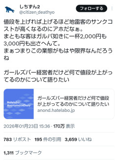 1: 2026/01/25(日) 14:34:49.69 値段を上げれば上げるほど地雷客のサンクコストが高くなるのにアホだなぁ。まともな客はガルバ如きに一杯2,000円も3,000円も出さへんて。まぁつまりこの業態がもはや限界なんだろうねガールズバー経営者だけど何で値段が上がってるのかについて語りたい — しちずん2 (@citizen_deathyo) January 23, 2026 ※関連記事 【画像】この漫画の「ダメ人間」と付き合っている彼女の話、少し怖くて草wwwww…