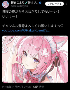 引用元: 84: Vtuberまとめ2026/01/25(日) 22:47:35.60 こより登録者が135万から134万に減ったこと効いて登録するよう呼びかけてます 94: Vtuberまとめ2026/01/25(日) 22:48:03.70 >>84 ホロ全体で減るかもな 102: Vtuberまとめ2026/01/25(日) 22:48:14.30 >>84 落ちるって異常事態だな 111: Vtuberまとめ2026/01/25(日) 22:48:31.64 >>102 ん? 121: Vtuberまとめ2026/01/25(日) 22:48:48.32 >>84 どーすんの 122: Vtuberまとめ2026/01/25(日) 22:48:48.93 >>84 こよりは数字めっちゃ見てるから登録者減るのは効いてそうだよなぁ 135: Vtuberまとめ2026/01/25(日) 22:49:10.59 >>84 135万人耐久すればよくね? 145: Vtuberまとめ2026/01/25(日) 22:49:18.41 >>84 別にこよりが炎上した訳じゃないしすぐ戻るかと思ったら全然戻らんな こより~😭 158: Vtuberまとめ2026/01/25(日) 22:49:42.76 >>84 ポストみてる人は登録してるんじゃないか?…