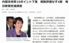 1: 名無し 2026/01/25(日) 16:23:09.66 ID:Tfx86uBN0 内閣支持率10ポイント下落 解散評価せず4割 毎日新聞世論調査…