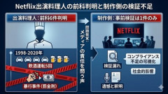1: 名無し 2026/01/25(日) 20:15:32.45 ID:UgQSQBaf0 ネットフリックスの料理サバイバル番組『白と黒のスプーン2』の出演者である料理人イム・ソングン氏を巡り、過去の飲酒運転などの前科が相次いで明らかになり、波紋が広がっています。 調査の結果、実際には前科が計6件に上ることが判明。1998年の道路交通法違反から2020年の飲酒運転まで、繰り返された刑事処罰歴に加え、相互暴行事件でも罰金刑を受けていたことが分かりました。制作陣は「2020年の1件以外は把握していなかった」と釈明しています。 KOREA WAVE / AFPBB News ■要約 ・Netflix番組出演者の料理人に前科6件が判明 ・1998年から2020年にかけて飲酒運転を5回繰り返す ・過去には暴行事件での罰金刑も含まれていた ・制作側は事前の検証が1件に留まったことを遺憾と釈明 ■解説 一人の出演者に、これほど多くの前科、それも飲酒運転という悪質な法令違反が繰り返されていた事実は驚愕に値します。ネットフリックスという巨大プラットフォームが制作に携わりながら、出演者の「身体検査」がいかに形骸化していたかを物語っています。 こうしたコンプライアンスの欠如は、エンターテインメントの質そのものを貶めるだけでなく、犠牲者を生みかねない犯罪を軽視しているとも取られかねません。高市政権が掲げるモラルの重視や、日本国内で厳格に運用されている放送倫理の観点から見れば、到底許容されるレベルではないでしょう。 隣国のエンタメ業界では、しばしばこうした「過去の不祥事」が露呈しますが、今回は回数も内容も常軌を逸しています。グローバルな配信サービスであっても、日本の視聴者に届ける以上は、日本国内の厳しい基準に照らした検証と誠実な対応が不可欠です。単なる釈明で済ませるのではなく、根本的な再発防止策が求められる局面です。 中道改革連合・野田共同代表「理不尽解散にノーの意思表示をしなければならない!」 生徒のJK達に圧勝してしまう女教師が見つかるww【News Headline】 【驚愕】 巨大カタツムリの ”殻だけ” を採取する方法、想像以上にエグくて震えた…(動画あり)…