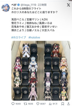 1: 2026/01/23(金) 18:37:18.18 これから8時間のフライトホロリスのあなたはどこに座りますか?兎田ぺこら / 宝鐘マリン / AZKi雪花ラミィ / 桃鈴ねね / 風真いろは百鬼あやめ / 猫又おかゆ / 星街すいせい博衣こより / 白銀ノエル / 大空スバル#ホロライブ #hololive pic.twitter.com/NN5FHfXl8S— べが (@Vega_1119) January 22, 2026 ※関連記事 【画像】これから10時間のフライトです、お前らならどこに座る?…