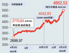 1: 名無し 2026/01/26(月) 08:05:42.18 ID:vM8kC1pY0 李在明(イ・ジェミョン)大統領が23日、KOSPI(韓国総合株価指数)が前日に取引場で5000を超えたことについて「大韓民国の企業がまともに評価されれば、国民みんなの財産が増える」と述べた。李大統領は大統領候補だった昨年5月、「KOSPI5000時代」を公約していた。 続いて「国民年金はわが国の企業の株を保有しているが、それが250兆ウォン(約27兆円)ほどに増え、ここにいる人たちの大半は年金の枯渇を心配をしなくてもよい状況になった」とも話した。ただ、株価の両極化、国民年金の将来の収益実現による株価への影響には言及しなかった。 中央日報日本語版 ■要約 ・KOSPI5000達成を受けて李大統領が公約実現をアピール ・国民年金の運用資産が250兆ウォン増加したと主張 ・株価上昇により年金枯渇の心配は不要になったと強調 ・造船業の賃上げを要求しつつ経済成果の国民還元を主張 ■解説 李大統領が誇らしげに語る「KOSPI5000」ですが、他国の株価上昇率と比較しても異常な突出ぶりであり、その持続性には強い疑問が残ります。実体経済が伴わない中での急激な株価高騰は、往々にしてバブル的な性質を帯びやすく、その崩壊が国民経済に与える打撃を考慮すれば、手放しでの称賛は極めて危ういと言わざるを得ません。 特に「年金の枯渇を心配しなくてよい」という発言は、将来の不確実性を無視した極めてポピュリズム的なものです。含み益が増えただけで制度の持続可能性が解決したかのように喧伝するのは、国民に対する誠実さを欠く行為でしょう。自国企業の株に大きく依存した運用は、市場が冷え込んだ際の共倒れリスクを増大させるだけです。 高市政権下の日本が追求すべきは、こうした一時的な数字の「爆騰」ではなく、経済安全保障に基づいた着実な成長と、強靭な財政・年金基盤の構築です。隣国の過熱した市場を冷静に観察しつつ、我々は地に足のついた経済政策を継続し、国家の安定を守り抜くことが肝要です。 【北海道】中国人の男が一時停止せず衝突、女※にけがさせ逃走⇒「標識の意味がわからなくて、交差点に入った」 日本で有効な免許なし 【朗報】 北欧美少女達のこってりベロチュー、あまりにも※※過ぎるwwwwwwwwwwwwwwww マンション高騰で人気爆発「狭小住宅」のデカすぎる落とし穴……