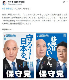 1: 名無しさん@ 2026/01/26(月) 16:17:07.45 ID:uHpPnFSO9 日本保守党の有本香代表代行が26日、自身のX(旧ツイッター)を更新。衆院選(1月27日公示、2月8日投開票)で使用するとみられる党のポスターのデザインを披露した。 「#日本保守党はこれでいきます」と前置きした上で2パターンのデザインを公開。百田尚樹代表が単独で写っているデザインには「守ろう!日本を。」とのコピーがあった。 百田氏と「北村弁護士」こと同党の北村晴男参院議員の2人が写っているデザインには「移民は もういらん。」とのコピーがあった。そして「移民政策の抜本的見直し」「食品の消費税 永遠に0(ゼロ)」「再エネの賦課金廃止」が掲げられていた(略) 引用元ソース 1/26(月) 12:44 3: 名無しさん@ 2026/01/26(月) 16:18:06.74 ID:eNnServt0 移民いないと夜中のバイト足りないでしょ? 4: 名無しさん@ 2026/01/26(月) 16:18:11.08 ID:SGZqV56u0 これこれ こういうのでいいんだよ! 5: 名無しさん@ 2026/01/26(月) 16:18:21.98 ID:tjiJXxjL0 キャッチフレーズだけで当選者増やした党あるし選挙はわかりやすさが大事 19: 名無しさん@ 2026/01/26(月) 16:22:20.30 ID:9rF5Bf1E0 代案は? 31: 名無しさん@ 2026/01/26(月) 16:31:50.70 ID:c20X6cgO0 ドイツでは極右政党が台頭しているようだし日本保守党も一定の議席は確保するだろうな 61: 名無しさん@ 2026/01/26(月) 16:54:42.61 ID:rpfCeg8U0 ニチホはもういらん 86: 名無しさん@ 2026/01/26(月) 17:05:29.45 ID:UizUxNUY0 働き手が足りないのにこれ以上人減らしてどうやってやってくつもりなの 130: 名無しさん@ 2026/01/26(月) 17:22:24.98 ID:Z/kuviW20 河村がいなくなった日本保守党なんてもう政党の体をなしてないだろ 引用元…