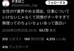 1: 2026/01/26(月) 17:09:28.17 女性がIT業界やめる理由、仕事についていけないじゃなくて同僚がチー牛すぎて無理ってのちょいちょいあって面白い— かまぼこ (@kamaboko__log) January 25, 2026 ※関連記事 IT業界は今後ヤバいと思う。大小問わずたくさんの会社が潰れまくると思うんやが…