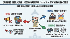 1: 名無し 2026/01/26(月) 20:18:45.33 ID:mX8k9Wq1a 衆議院選挙の公示日をあす(27日)に控え、外国人の人権問題などに取り組む11の団体が共同声明を発表し、各政党や候補者に対して、ヘイトスピーチなど外国人への偏見を煽らないよう求めました 「『外国人が優遇されている』『外国人による犯罪が多い』などというのは、根拠のないデマです」と事務局長は指摘しています 報道機関に対しても、デマやヘイトスピーチについて“ひとつの意見”として扱わず、明確に批判するよう求めました TBS NEWS DIG ■要約 ・衆院選公示を控え外国人支援11団体が共同声明 ・選挙中のヘイトスピーチや根拠のないデマの拡散を警告 ・各政党や候補者に偏見を煽らないよう強く要請 ・報道機関にも差別発言を単なる意見とせず明確な批判を要求 ・昨年の選挙での深刻な人権侵害と社会の分断を批判 【北海道】中国人の男が一時停止せず衝突、女※にけがさせ逃走⇒「標識の意味がわからなくて、交差点に入った」 日本で有効な免許なし 【悲報】 中道改革連合、終わる。最新の投票先で自民にダブルスコアをつけられ絶望へwww マンション高騰で人気爆発「狭小住宅」のデカすぎる落とし穴……