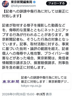 1:フィシスファエラ(東京都) [NL]:2026/01/26(月) 21:19:04.73 ID:gjSAfvu10● 自分たちは好き勝手に誹謗中傷してるのにされるのは許さないってマジで頭おかしい 本紙記者の取材活動を誹謗中傷する動画などをアップロードする行為が確認されています。今後もこうした行為が続く場合は、刑事告訴を含め厳正に対処します。— 東京新聞編集局 (@tokyonewsroom) January 26, 2026 3:エアロモナス(茸) [US]:2026/01/26(月) 21:20:49.83 ID:nXF5EiB20 所属する記者の行う誹謗中傷は?…