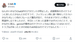 1: 2026/01/27(火) 09:16:53.60 人気漫画・アニメ作品『Dr.STONE』の科学監修を務める くられ(@reraku)氏は1月26日、自身の「ChatGPT」のアカウントが停止されたことをXで報告した。 くられ氏によると、ChatGPTでフィクション作品用の調べ物をしていた際、突然、武器製造関連のガイドライン違反を指摘する警告が表示され、アカウントが停止状態へ移行。サービス提供元のOpenAIに復旧を求めたが、拒否されてしまったという。 同氏は本件について「なかなかに困る」としつつ、グーグルの生成AI「Gemini」が優秀なので、ChatGPTなしでも「クリティカルに困ることはない」と説明している。 なんかいきなりChatGPTのアカウントが停止した。武器製造のガイドラインに反したとかなんとかだそうで、フィクション用に調べ物をしてたらいきなりオレンジ色のフレームで警告が出て、そのままアカウント停止で、異議申し立てをしたけど、半日たってあった返事ではダメとのことで、なかなかに困る。gem…— くられ (@reraku) January 26, 2026 ※関連記事 【悲報】 ChatGPTさん、狩野英孝に敗北…