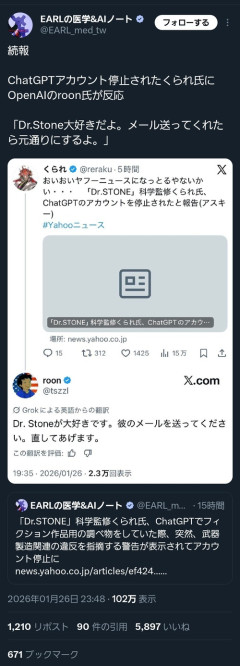 1: 2026/01/27(火) 10:03:45.81 ↓ ↓ えーと、こちらの件がどえらい話題になって、OpenAIの中の人にまで届いてしまい、アカウントの復旧のお話までいただきました。結論として、個人的なアカウントの復旧はフェアではないのでお断りしました… — くられ (@reraku) January 26, 2026 ※関連記事 【悲報】ChatGPTに「お前」呼びされてるんやが…