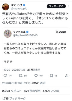 1: 2026/01/27(火) 07:56:09.48 元有名YouTuberが全力で煽ったのに全然炎上していないのを見て、「オワコンて本当にあるんだな」と実感しました。 pic.twitter.com/cA5quRELKt— まことぴ (@makotopic) January 26, 2026 ※関連記事 【画像】チョコプラ松尾、また炎上wwwwwwwwwwwwwww…