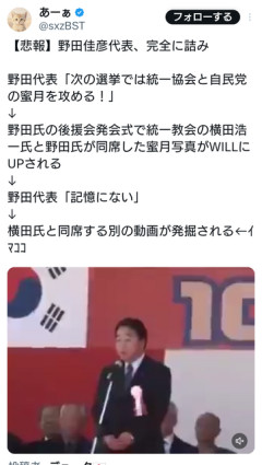 1: バチルス(東京都) [US] 2026/01/27(火) 09:25:29.23 ID:HK1pN4qe0● BE:662593167-2BP(2000) sssp://img.5ch.net/ico/taxi.gif 2: バチルス(東京都) [US] 2026/01/27(火) 09:26:10.99 ID:HK1pN4qe0 BE:662593167-2BP(1000) sssp://img.5ch.net/ico/taxi.gif 引用元: ・ スポンサーリンク スポンサーリンク 47: ストレプトミセス(東京都) [US] 2026/01/27(火) 09:41:31.32 ID:0MrTdXP60 >>1 うは、中革連やべえな 公明ソウカにくわえて立憲の立正.佼成会が融合してさらに統一教会かよ・・・ 地獄のカルト軍団じゃん 58: スフィンゴバクテリウム(東京都) [US] 2026/01/27(火) 09:44:45.56 ID:Dm3TXaos0 >>47 ワールドメイトも軍団に入れてやれ 338: ネンジュモ(茸) [FR] 2026/01/27(火) 12:03:42.98 ID:Ntzx/UoY0 >>1 立憲は統一関係の内部調査を拒否してるからな。 341: ニトロソモナス(庭) [US] 2026/01/27(火) 12:06:12.09 ID:dxJ81Bmj0 >>1 統一自民党と道連れで自爆か! 40: アナエロリネア(庭) [GB] 2026/01/27(火) 09:39:31.44 ID:F8a/UAua0 >>2 あららこれは言い逃れできないやつ 44: リケッチア(庭) [ニダ] 2026/01/27(火) 09:41:02.54 ID:mKrCOOpT0 >>2 民団じゃん だから韓日友好 80: スフィンゴモナス(ジパング) [AU] 2026/01/27(火) 09:52:45.23 ID:rhgaa/tO0 >>2 野田じゃんwww 123: キサントモナス(兵庫県) [JP] 2026/01/27(火) 10:10:33.79 ID:zGip1zty0 >>2 これ安倍さんの社交辞令ビデオなんか比べものならんぐらいずぶずぶやん 山ゴミはこのひとサツせば良かったんや 304: ゲマティモナス(ジパング) [ニダ] 2026/01/27(火) 11:24:37.09 ID:6/5ly+cd0 >>2 昨年に続きお呼ばれしましたってことは最低でも2回はあるんだね。 覚えてないってのもおかしいね。 369: テルモデスルフォバクテリウム(茸) [CZ] 2026/01/27(火) 12:26:13.38 ID:uGhDaI3R0 >>2 聞いてないよー! 4: フソバクテリウム(やわらか銀行) [ニダ] 2026/01/27(火) 09:27:32.66 ID:KSSmFgeH0 ソース統一教会なのすごいよな こういう強請ネタ他にも持ってるんだろうな 22: デロビブリオ(東京都) [ニダ] 2026/01/27(火) 09:33:44.26 ID:1gXFQHGg0 >>4 まあそれで日本を制圧しようとしてるんだろう 江戸幕府での柳生一族みたいなもんかな あとユダヤロビーもそうか 結局スパイが勝つんだよ そしてスパイがスパイ防止法を作ろうってさ、 スパイ防止法を作った時点で乗っ取り完了、 与党議員はなにかしらのシモ系のネタを抑えられててもう覆せない、って 51: クテドノバクター(新日本) [US] 2026/01/27(火) 09:43:09.68 ID:n9bl20F00 >>4 韓国よりだったのに 公明と一緒になって中国よりになったから 裏切られたと思って出してきたのかもね 171: ハロプラズマ(庭) [US] 2026/01/27(火) 10:23:38.26 ID:6fKyPYv40 >>51 なるほど あり得るな 331: プランクトミセス(やわらか銀行) [BR] 2026/01/27(火) 11:55:11.72 ID:2l+JH1/I0 >>4 流石に恩知らずすぎるからでは 415: メチロコックス(茸) [ニダ] 2026/01/27(火) 13:23:05.62 ID:DmLoZhZX0 >>4 与党自民党にすがった統一 野党民主党を与党にしてやった統一 どっちも恨めど度合いが違うからな 436: スファエロバクター(ジパング) [CN] 2026/01/27(火) 14:15:57.67 ID:EEc9ZUZP0 >>4 後出しすぎるな 安倍さんの時に出せたろ やっぱり統一が放った刺客が山上なのでは? 山上は統一の施設内で射撃練習してたんだぞ 5: テルモアナエロバクター(みょ) [CN] 2026/01/27(火) 09:28:03.59 ID:nhSw++fA0 中革派は既に敗戦の責任を全て野田に押し付ける作戦に移行したんだな まあ愚民ガーからは進歩したんだろうが創価的に 落選するのは信心が足りない!になるまで折伏が必要だな 8: デイノコック(ジパング) [US] 2026/01/27(火) 09:28:31.40 ID:h4CNVmYP0 willは自民党の議員も写真アップしなよ。 15: クラミジア(やわらか銀行) [US] 2026/01/27(火) 09:31:19.46 ID:35ghtpdh0 >>8 アカヒ変態毎日イソ子左派ゴミ沢山いるんだから探して来ればwww 121: メチロフィルス(大阪府) [FR] 2026/01/27(火) 10:10:13.09 ID:EgRW2f2a0 >>8 Willが今更やらんでも散々やられてきたろw 199: クテドノバクター(ジパング) [CL] 2026/01/27(火) 10:34:15.32 ID:z9nWnV3y0 >>8 今まで何を見てきたんだよ その上でさもクリーンな方々がいま暴かれてんだよ 9: 名無しさん@涙目です。(東京都) [US] 2026/01/27(火) 09:28:37.43 ID:aHek1qjq0 立憲議員が合併にぶちギレたんだろうなあw 25: テルモアナエロバクター(みょ) [CN] 2026/01/27(火) 09:34:56.00 ID:nhSw++fA0 >>9 カメラの位置的に 正面じゃ無いから当時の秘書とか事務所の奴だろうな 12: オセアノスピリルム(庭) [DE] 2026/01/27(火) 09:30:05.45 ID:DecJOQ8G0 紀藤正樹や江川紹子は下向いちゃったw 275: デスルフレラ(やわらか銀行) [US] 2026/01/27(火) 11:04:57.53 ID:ZmwB51uI0 >>12 この2人にもケジメつけさせないとだめや 人ならざる発言繰り返して完全に化け物に落ちた 14: オセアノスピリルム(庭) [DE] 2026/01/27(火) 09:31:07.45 ID:DecJOQ8G0 立憲民主党は別の党なんだしこれまで通り日本共産党と一緒に「勝共連合を許すな」と中道改革連合を批判すれば良いだけなのにな 別の党ですよ 20: スネアチエラ(ジパング) [ニダ] 2026/01/27(火) 09:33:11.63 ID:/7uEDBeb0 旧ミンスでまだチョーセンカルトとの関係バレてない奴いっぱいおるんやろなw 21: コリネバクテリウム(茸) [FR] 2026/01/27(火) 09:33:34.75 ID:fc1G8SVP0 日韓友好じゃなくて韓日友好 これは本物ですわ 321: ビブリオ(茸) [CN] 2026/01/27(