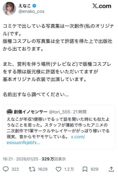 【炎上】素人「えなこが二次創作で儲けてるのモヤモヤする」えなこ「収益は全部一次創作からです」←炎上。素人「論点ずらすな!」