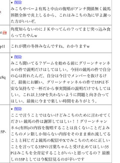 引用元: 343: Vtuberまとめ2026/01/27(火) 19:41:13.01 競馬界は甘くなかった 388: Vtuberまとめ2026/01/27(火) 19:42:29.40 >>343 こんな真剣な訴えを削除したんか 393: Vtuberまとめ2026/01/27(火) 19:42:42.57 >>343 これ35Pが注意しなかったら多分炎上せずに終わったんだよな 403: Vtuberまとめ2026/01/27(火) 19:43:01.96 >>343 削除 ↑ これ無慈悲すぎるだろ 414: Vtuberまとめ2026/01/27(火) 19:43:20.67 >>393 まじかよ35P許せねぇわ 425: Vtuberまとめ2026/01/27(火) 19:43:39.43 >>343 実際これ関係ない枠のスパチャで言う事なん?て思うわ 448: Vtuberまとめ2026/01/27(火) 19:44:17.25 >>343 反転多い理由これか 449: Vtuberまとめ2026/01/27(火) 19:44:21.55 >>343 間違ったムーブをした者の末路 477: Vtuberまとめ2026/01/27(火) 19:44:55.49 >>425 復唱しなかったらそもそもこんな指摘しなくて済んだんだけど 493: Vtuberまとめ2026/01/27(火) 19:45:27.92 >>343 手帳キモすぎ 554: Vtuberまとめ2026/01/27(火) 19:46:46.35 >>477 Xとかそれこそ競馬のコメント欄でいいじゃん わざわざ反応出来ないリアルタイムの配信で言うのアホだろ 573: Vtuberまとめ2026/01/27(火) 19:47:08.07 >>554 復唱しなかったらそもそもこんなことは起きなかった他責思考やめてね 574: Vtuberまとめ2026/01/27(火) 19:47:08.02 >>343 こいつらが無駄に騒いだせいで燃えたんだが 641: Vtuberまとめ2026/01/27(火) 19:48:21.85 >>573 同じ言葉返されて2度見したわ 返す言葉ないと捉えます 667: Vtuberまとめ2026/01/27(火) 19:48:44.53 >>641 お前は理解する頭がないと捉えます 709: Vtuberまとめ2026/01/27(火) 19:49:36.55 >>574 既に競馬界からぼろくそ叩かれた後だよ 817: Vtuberまとめ2026/01/27(火) 19:52:00.37 >>343 Xでこういうコメント消してるのを 「隠れアンチや不穏分子を排除できてかえって良かった」 とか言ってる53Pいて戦慄した…