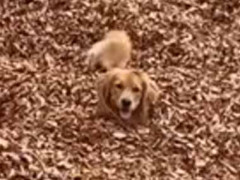 飼い主さんと遊ぶワンコ。 ほら、取ってこい! 落ち葉の海でこんな感じ……