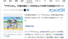 1 : 日本屈指の長寿アニメ『サザエさん』の海外進出が決定。2026年1月26日(月)より台湾での放送がスタートする。 アニメ『サザエさん』は長谷川町子によるマンガが原作。1946年から「夕刊フクニチ」「新夕刊」「夕刊朝日新聞」で、1951年から1974年まで「朝日新聞」朝刊にて連載された。 1969年にはテレビアニメの放送がスタート。フジテレビの日曜日18時30分の定番として、昭和・平成・令和と長く愛され続けている。 2024年10月には放送55周年を迎え、「最も長く放映されているテレビアニメ番組」のギネス世界記録を更新した。 そんな長寿アニメ『サザエさん』が、台湾に進出。初回はケーブルテレビ「MOMOTV」にて、2026年1月26日(月)に放送される予定だ。 全文はソースで…