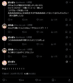 928. 名無しのリスナー ポップンに脳を焼かれた者たち 元ポスト ぷれぁさんが最近ぽぷの話しかしないからひとりフロウビート聞いてコーヒー飲んでコアグルーヴを流してはああああああDes-ROW先生すきやあああああってなってるだんだんだん!(男々道押しミス)— ぽぅぽぅ (@polkasub) January 27, 2026 関連記事 【ホロライブ】フレアのポップン配信、あまりにも最高だった『めっちゃ懐かしい』『上手すぎて草』『推し語り助かる』 2026/01/27(火) 23:10:44.39 ID:l8CZ/vig0…