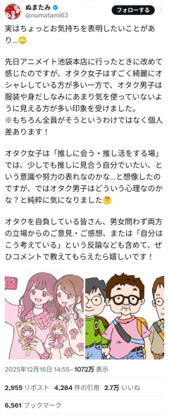 1: 2026/01/28(水) 15:10:17.18 たしかに 実はちょっとお気持ちを表明したいことがあり…🙄先日アニメイト池袋本店に行ったときに改めて感じたのですが、オタク女子はすごく綺麗にオシャレしている方が多い一方で、オタク男子は服装や身だしなみにあまり気を使っていないように見える方が多い印象を受けました。… pic.twitter.com/eBWbkPBgTZ— ぬまたみ (@numatami63) December 16, 2025 ※関連記事 【画像】地味オタク女子さん、とんでもないメロンを披露してしまうwwwwwwwwww…