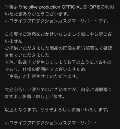 引用元: 90: Vtuberまとめ2026/01/27(火) 19:34:13.87 これはちょっと酷くね? あんず🌽🌸☄👾⚓ @anzu107_107 (2026/01/26 20:15:27) ホロライブさん的にはこの程度の塗装剥がれは初期不良じゃなくて「良品」らしいです 対戦ありがとうございました [引用元] あんず🌽🌸☄👾⚓ @anzu107_107 (2026/01/19 21:07:04) ござるさんの生誕ネックレスちょっと塗装欠けみたいなのあるの悲しい😭 100万人のミラーほど破損酷いわけじゃないけどこういうのって交換して貰えるのかな まあどの道普段使いで傷つくだろうから良いけどさぁ… ござるさんの生誕ネックレスちょっと塗装欠けみたいなのあるの悲しい😭100万人のミラーほど破損酷いわけじゃないけどこういうのって交換して貰えるのかなまあどの道普段使いで傷つくだろうから良いけどさぁ… pic.twitter.com/eakV78Psww — あんず🌽🌸☄️👾⚓️ (@anzu107_107) January 19, 2026 128: Vtuberまとめ2026/01/27(火) 19:35:11.51 >>90 次はござる攻撃したらいいの? 134: Vtuberまとめ2026/01/27(火) 19:35:20.27 >>90 普通に酷いな まあもう不良品送りつける企業なのはわかってるが 166: Vtuberまとめ2026/01/27(火) 19:36:12.07 >>128 そういうことじゃない 186: Vtuberまとめ2026/01/27(火) 19:36:39.29 >>90 カバーが不良品だからしょうがない 191: Vtuberまとめ2026/01/27(火) 19:36:43.98 >>90 酷すぎてもうここまで来るとこの会社の商品を買う方が悪いレベルだな 455: Vtuberまとめ2026/01/27(火) 19:44:27.39 >>90 ござるのグッズ前も破損報告上がってたろ冷遇か? 464: Vtuberまとめ2026/01/27(火) 19:44:37.47 >>90 これって購入前の注意事項で触れてるの? 494: Vtuberまとめ2026/01/27(火) 19:45:28.35 >>455 かなたが検品もやらされてたのか 522: Vtuberまとめ2026/01/27(火) 19:46:07.93 >>494 死人に口無しとばかりに罪を押し付けてやるなよ 613: Vtuberまとめ2026/01/27(火) 19:47:53.39 >>90 受注生産だろうし代え効かないからしかたないわな 652: Vtuberまとめ2026/01/27(火) 19:48:34.34 >>191 変なもの買うからだろ アクスタとラバキーと缶バッジ以外は危険というか開けてないけど俺の沙花叉かるたも印刷ぐちゃぐちゃかもしれないのか確認しとくか 679: Vtuberまとめ2026/01/27(火) 19:48:57.52 >>90 ここ? まぁ気にすんな 761: Vtuberまとめ2026/01/27(火) 19:50:44.23 >>679 これくらいなら気にするもんじゃ無いかもな 内側の黒い箇所かと思ったわ 787: Vtuberまとめ2026/01/27(火) 19:51:19.69 >>679 新品買ってこれなら怒ってもよくね 843: Vtuberまとめ2026/01/27(火) 19:52:31.93 >>90 えぇ….(困惑)…