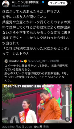 引用元: それでも動く名無し 2026/01/28(水) 18:44:40.44 ID:QYCGTdHyr 2: それでも動く名無し 2026/01/28(水) 18:45:20.20 ID:W3ldh/lgH 共産党ですらドン引きするレベル 3: それでも動く名無し 2026/01/28(水) 18:45:24.76 ID:XAv7MGXX0 草 4: それでも動く名無し 2026/01/28(水) 18:45:35.81 ID:MB0gAdlx0 草…