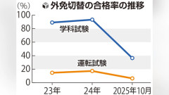 外国の運転免許証を日本の免許証に切り替える「外国免許切替(外免切替)」制度の審査が昨年10月に厳格化されたことで、静岡県内の運転免許センターでの合格率が大幅に低下している。県警によると、学科試験の合格率は約9割から改正後の1か月間で4割以下に落ちていた。県内の自動車学校では、試験対策の講習内容を見直す動きも出ている。(栗山泰輔) 外国人が日本で運転する方法は、〈1〉「道路交通に関する条約(ジュネーブ条約)」の加盟国が発行した国際免許証〈2〉日本と同水準の免許制度の国・地域の免許に日本語の翻訳文を添付〈3〉外免切替などで日本の免許を取得――の三つだ。 しかし、外免切替で免許を取得した外国人による交通事故が相次いだことを受け、住所確認が厳格化されたほか、学科試験や運転試験の合格基準も引き上げられた。 学科試験である「知識確認」では、従来はイラスト問題10問で70%以上が合格基準だったが、見直し後は多言語で作られた文章問題50問で90%以上を合格基準とした。また、運転試験である「技能確認」では、横断歩道の通過方法や踏切の一時停止などの新しい課題が追加されたほか、審査基準も厳しくした。 県警運転免許課によると、見直し後の昨年10月中の学科試験の合格率は、見直し前の2024年の93・3%から36・5%まで低下。運転試験では24年の17・3%から6・4%に低下した。…