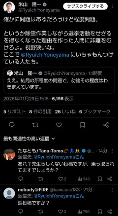 1 : 誤爆ツイート(削除済み) 「自演?」「誤爆?」米山隆一氏Xアカウントで擁護の投稿→削除 その真相は?本人が経緯を説明: J-CAST ニュース 雪かき動画で波紋を広げている中道改革連合・米山隆一前衆院議員(58)が2026年1月29日にXで、「これ自演?」「誤爆?」などと指摘する声が上がった、米山氏の除雪作業を擁護する投稿(現在は削除済み)について、スタッフのミスだったと説明した。全文はソースで…