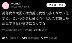 【悲報】女さん「男尊女卑の日本ではオジ化した女性しか出世出来ない」X民「それ競争に最適化しただけで男の多くがそう生きてる」?」