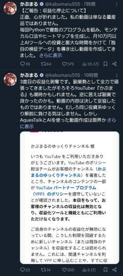 1: 2026/01/29(木) 18:57:58.45 【ご報告:収益化停止について】正直、心が折れました。私の動画は単なる量産品ではありません。毎回Pythonで複数のプログラムを組み、モンテカルロ法やヒートマップを生成し、月10万円以上AIツールへの投資と膨大な時間をかけて「独自の検証データ」を導き出し動画を作成してきました。…— かぶまる (@kabumaru555) January 29, 2026 ※関連記事 【画像】この漫画の「ダメ人間」と付き合っている彼女の話、少し怖くて草wwwww…