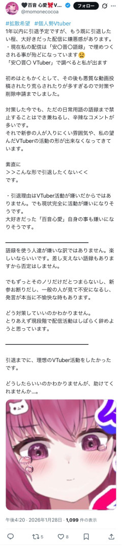 【悲報】ケンモメンに人気だったVtuberさん、「安倍晋三連呼民のせいでまともな活動ができない」と引退宣言