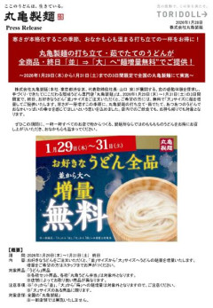 1: 2026/01/29(木) 08:24:56.62 ID:/Bf63mxh0● BE:567637504-PLT(56555) 讃岐うどん専門店「丸亀製麺」は、あす29日~1月31日の3日間限定で、うどん「並」サイズ注文者に対し、無料で「大」サイズに増量するキャンペーンを全国の店舗で実施する。 「寒さが一層増すこの季節に、丸亀製麺の打ち立て・茹でたて、あつあつのうどんでおなかいっぱいの幸せを感じてほしいという想いを込めました」と説明。 持ち帰りも対象となり、「ぜひこの期間に、一軒一軒すべてのお店で粉からつくる、製麺所ならではのもちもちのうどんをお得にお召し上がりいただき、おなかも心も温まってください」と呼びかける。 期間: 2026年1月29日(木)~1月31日(土) 終日 内容: 好きなうどんを「並」サイズから「大」サイズへ麺量を増量。 増量をご希望の方はスタッフまでお声がけください。 対象商品: 「うどん」商品 ※各種セット商品、各種「丸亀うどん弁当」は対象外 ※店舗によってお取り扱い商品が異なる ※「小」から「並」、「大」から「得」への麺増量は対象外 ※「大」サイズのある商品に限る ※一部店舗では実施しない 2: 2026/01/29(木) 08:25:46.48 ID:V0rvOAgj0 デブのお前ら大歓喜 5: 2026/01/29(木) 08:29:01.33 ID:9T6r9bjh0 大を並と同じ値段にするならわかるが なんで並を無料で大になんて店員が苦労する方法にしたんだ? 7: 2026/01/29(木) 08:40:15.79 ID:V0rvOAgj0 >>5 4サイズあるから大(1.5玉)で頼めば並の値段ってことだろ 大にするのを無料にすると小→大でも小値段で買えることになるからな なにが店員に負担かかるの? 22: 2026/01/29(木) 09:04:18.56 ID:UFhP09Pi0 >>5 意味同じだろ 8: 2026/01/29(木) 08:41:37.26 ID:Z9jA7Xs00 でもお前らは小にして糖質に気をつけなきゃダメだろ? 9: 2026/01/29(木) 08:41:45.07 ID:sE7mjEK+0 値上げでよほど客が離れたんだろうな 14: 2026/01/29(木) 08:51:14.28 ID:POOTcEUS0 久しぶりにかけうどんと天ぷら食べようか -->…