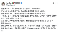 1:muffin ★ 2026/01/29(木) 23:14:00.48 ID:ZtieerEX9 《タイ国籍の少女を性的搾取していたことが発覚して、世界から「日本は男性の性欲に甘い国」と言われていることを、日本人ははっきり自覚し、恥じるべきだ。》 2025年12月に『NEWSポストセブン』で連載中のエッセイで、痛烈な言葉を書き記し、大きな反響を呼んだ、元フジテレビアナウンサーで、現在はフリーの渡邊渚。この渡邉の主張に、イタリア・フィレンツェ在住のオペラ歌手、清水晴子氏が反論し、話題を呼んでいる。 「渡邉さんはエッセイの中で、2025年11月に東京・文京区の個室マッサージ店で、わずか12歳のタイ人少女が性的サービスを強要されていた事件を引き合いに、『日本で多発する性的搾取』や買春、わいせつ事件についての率直な思いを告白して、当時、大きな反響を呼びました。 中略 そんななか、フィレンツェ在住の清水氏は、1月25日までに自身のXを更新。渡邉の記事のURLを貼り付けたうえで、《渡邊渚さんの「日本は性欲に甘い国だ」という嘆き。フィレンツェの空の下で、私は深い溜め息をついてしまう》と切り出すと、《誤解を恐れずに、海外在住の視点から残酷な真実を言おう。「痴漢」という言葉がこれほど定着しているのは、日本が「世界でも異常なほど安全な国」だからだ》と指摘。渡邉の主張に異を唱えた…続きはソース元で 渡邊渚さんの「日本は性欲に甘い国だ」という嘆き。フィレンツェの空の下で、私は深い溜め息をついてしまう。誤解を恐れずに、海外在住の視点から残酷な真実を言おう。「痴漢」という言葉がこれほど定着しているのは、日本が「世界でも異常なほど安全な国」だからだ。… — Harukon🇮🇹FIRENZE (@harukon_et) January 25, 2026…