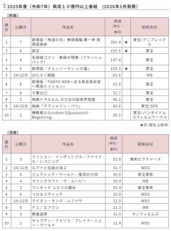 1:映画.netがお送りします 2026/01/29(木) 01:47:58.25 ID:GEzCGahg0.net BE:242521385-2BP(5000) 2:映画.netがお送りします 2026/01/29(木) 01:48:12.92 ID:GEzCGahg0.net BE:242521385-2BP(5000) >>1邦画 1位 鬼滅の刃 391億 2位 国宝 195億 3位 名探偵コナン 147億 4位 チェンソーマン 104億 5位 はたらく細胞 63億 6位 TOKYO MER 52億 7位 8番出口 51億 8位 ドラえもん 46億 9位 グランメゾン・パリ 42億 10位 ガンダム 36億洋画 1位 ミッション:インポッシブル 52億 2位 モアナと伝説の海2 51億 3位 ジュラシック・ワールド 49億 4位 マインクラフト 39億 5位 ウィキッド 35億 6位 リロ&スティッチ 33億 7位 ライオン・キング 22億 8位 F1 21億 9位 教皇選挙 11億 10位 キャプテン・アメリカ 11億 3:映画.netがお送りします 2026/01/29(木) 01:48:27.97 ID:GEzCGahg0.net どう思った? スレッドURL: 4:映画.netがお送りします 2026/01/29(木) 01:48:35.97 ID:GEzCGahg0.net このデータから読み取れることは? 5:映画.netがお送りします 2026/01/29(木) 01:48:52.91 ID:Q0fTmhQm0.net ジークワックスだけみた おもろかったわ 6:映画.netがお送りします 2026/01/29(木) 01:50:01.79 ID:F96noCb80.net ジュラシックシリーズまだそんな見られてるんだな 腐っても恐竜か侮れねえぜ 7:映画.netがお送りします 2026/01/29(木) 01:50:12.81 ID:L9WypsMw0.net 幼稚な国民性 10:映画.netがお送りします 2026/01/29(木) 01:51:56.79 ID:yH2UNcQr0.net >>7 ジャニーズと女アイドルが濡れ場やってるだけの恋愛ものよりマシ 8:映画.netがお送りします 2026/01/29(木) 01:50:46.35 ID:01BMneWX0.net 果てしなきスカーレット死んでもうたん 15:映画.netがお送りします 2026/01/29(木) 02:01:08.58 ID:K41daF1/0.net >>8 そもそも11月末くらいの公開だしなあれ 9:映画.netがお送りします 2026/01/29(木) 01:51:49.09 ID:x9zSfDL+0.net 気持ち悪いおばさんのすくつなんだなって 11:映画.netがお送りします 2026/01/29(木) 01:52:20.63 ID:NmTIvzJW0.net 教皇選挙しかみてない 12:映画.netがお送りします 2026/01/29(木) 01:54:02.19 ID:ED4GSduw0.net お前らが叩きたいだけ叩いたチェンソーマン100億行ったのか 凄いな 21:映画.netがお送りします 2026/01/29(木) 02:26:10.96 ID:+cVgfLhF0.net >>12 ここでもどこでも散々叩かれてたのはTVアニメの1期だけで劇場版の方は嫌儲もかなり肯定的だったが 13:映画.netがお送りします 2026/01/29(木) 01:55:54.94 ID:yIl2PkaT0.net はたらく細胞如きが洋画上回るのか 世も末だね 23:映画.netがお送りします 2026/01/29(木) 02:33:08.89 ID:rqacR4Wq0.net >>13 永野芽郁の太ももパワー凄かったからね 14:映画.netがお送りします 2026/01/29(木) 01:59:18.93 ID:big9G/2q0.net ○VATAR面白かったけど年末だったからね 16:映画.netがお送りします 2026/01/29(木) 02:02:11.72 ID:K41daF1/0.net まあ洋画より邦画の方が強いのは悪くない傾向だと思うな 17:映画.netがお送りします 2026/01/29(木) 02:02:50.77 ID:USf6EwDK0.net ワーナー死んだらもう東宝1強になっちゃうな 18:映画.netがお送りします 2026/01/29(木) 02:06:18.65 ID:54UmCGBO0.net いいだろ! 19:映画.netがお送りします 2026/01/29(木) 02:08:23.37 ID:7acyRg0D0.net 幼稚でバカな国民が多そうで草 20:映画.netがお送りします 2026/01/29(木) 02:21:26.28 ID:lOEnHnCh0.net 国宝がヒットしたのは日本人の国民性が出てるわ 周りが見てるから見ないとだろ? 22:映画.netがお送りします 2026/01/29(木) 02:26:37.41 ID:IktInVS30.net 今年は外画が強いらしいけどどうなんだろうな続編も多いし アニメは何もないんだよな新海がだせればいいけど 26年は去年の反動が大きい年になりそうな気がする 25:映画.netがお送りします 2026/01/29(木) 02:36:55.43 ID:pIDrB2OA0.net はたらく細胞ってそんな人気だったのか 26:映画.netがお送りします 2026/01/29(木) 02:43:00.82 ID:YyLJahyV0.net >>25 腐女子に大人気だからな 27:映画.netがお送りします 2026/01/29(木) 04:18:19.75 ID:qqiot95e0.net こんなの通しちゃ駄目だよ 28:映画.netがお送りします 2026/01/29(木) 04:54:24.94 ID:G/QuOlmk0.net 事実上論破をさせていただいたと思っている 29:映画.netがお送りします 2026/01/29(木) 04:58:19.09 ID:CV1GAR+Pd.net 当たるジャンルがガラパゴとかじゃなくて 既に世界で斜陽傾向の映画興行自体が全然元気なのがガラパゴ 31:映画.netがお送りします 2026/01/29(木) 05:49:24.46 ID:fvpDgaDl0.net 今年はトイスト、マリオ、アベンジャーズ、スターウォーズ、金カム、キングダム、教場、ルックバックあたりか… 34:映画.netがお送りします 2026/01/29(木) 06:32:15.08 ID:Svzetxgl0.net 90年代は洋画2:邦画1だったからな 完全に逆転したな 35:映画.netがお送りします 2026/01/29(木) 06:44:06.55 ID:bZ9zhLeb0.net こんなもんじゃね 80年代90年代のハリウッドが強すぎただけで 36:映画.netがお送りします 2026/01/29(木) 06:57:23.56 ID:K0Gz9TKC0.net この表で一番出来のいいF1が21億しかないのか 37:映画.netがお送りします 2026/01/29(木) 07:08:24.43 ID:3Rg4qdim0.net 過去に行ったら話してやりたいところだ アニメ映画だらけになってるよ!でも、お前のみたいものはないガンダムも残ってるが言うまでもなく 38:映画.netがお送りします 2026/01/29(木) 07:09:05.93 ID:Y78XQr6I0.net これガンダムは成功してるラインなの 39:映画.netがお送りします 2026/01/29(木) 07:39:21.70 ID:CV1GAR+Pd.net 最高のSEEDでも50憶だから これで失敗だったら他の劇場ガ