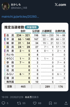 【速報】自民党、321議席獲得で単独3分の2以上の可能性が報じられ始めるwwww