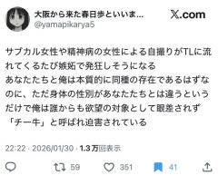 1: 2026/01/31(土) 03:52:45.62 サブカル女性や精神病の女性による自撮りがTLに流れてくるたび嫉妬で発狂しそうになるあなたたちと俺は本質的に同種の存在であるはずなのに、ただ身体の性別があなたたちとは違うというだけで俺は誰からも欲望の対象として眼差されず「チー牛」と呼ばれ迫害されている— 大阪から来た春日歩といいます よろしくおねがいします (@yamapikarya5) January 30, 2026 ※関連記事 【衝撃】精神病を自覚した人、『自分の被害妄想に気付く』というとんでもないアハ体験を経験する……