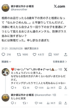 1: 2026/01/31(土) 08:05:46.53 相席のお店行ったら8歳年下の男の子と相席になって「なんかごめんね…」と平謝りしてたんだけど、冷静に考えたら自分より一回り下の女子を普通にアリとして狙えるおじさん達のメンタル、防弾ガラス並みに強すぎない?私には無理だった。申し訳なさ過ぎた— 彼か彼以外か@婚活 (@kareorother) January 28, 2026 👩🏻「相席屋で8歳下…」ガツガツ🍖🧑🏻🦱「あ、はい」👩🏻「ほんと申し訳ない」ムシャムシャモグモグ🍝👩🏻「なんかごめんね」グビグビ🍺🧑🏻🦱💴 👨🏻「お会計です」👩🏻「一回り歳下女子を狙えるおっさんのメンタル強すぎない?」ゲフッ — みさゑ (@mirroringmisae) January 30, 2026 ※関連記事 【悲報】相席屋、男が絶滅し終わるwww…