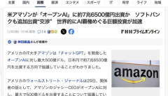 1 : なおソフトバンクも約5兆円の追加融資する模様 米アマゾンが「オープンAI」に約7兆6500億円出資か ソフトバンクも追加出資“交渉” 世界的にAI覇権めぐる巨額投資が加速(FNNプライムオンライン(フジテレビ系)) - Yahoo!ニュースアメリカのIT大手アマゾンは「チャットGPT」を開発したオープンAIに対し最大500億ドル、日本円で約7兆6500億円を出資する方向で協議していることがわかりました。 アメリカのウォールストリート・ジャーナルは29日、関係者の話として、アマゾンのジャシーCEOがオープンAIに対し、最大で500億ドルを出資することについて協議していると報じました。 また、これまでに225億ドルを出資しているソフトバンクグループも、最大300億ドルを追加出資する方向で交渉していると報じられるなど、世界的に生成AIの覇権をめぐる巨額投資の動きが加速しています。全文はソースで…