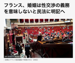 1: ななしさん@発達中 2026/01/30(金) 18:45:50.12 BE:306759112-BRZ(11000)ID:NgaEBljg0 フランス、婚姻は性交渉の義務を意味しないと民法に明記へ フランス国民議会は28日、民法に「共同生活」が「性的関係の義務」を生み出すものではないという条項を追加する法案を可決した。婚姻は性行為の義務を意味するという、いわゆる「配偶者間の義務」の考え方を断ち切る。また今後は、離婚請求手続きにおいて、性的関係の欠如を婚姻破綻の理由として用いることができなくなる。裁判所に大きな影響を与える可能性は低いとみられているが、法案の支持者らは、配偶者によるレ○プを抑止する助けになると期待している。この法案を提出した緑の党のマリー=シャーロット・ギャラン下院議員は、「こうした権利や義務を存続させれば、私たちは夫が妻を支配し搾取する構造を、集団として容認することになる」と述べた。…