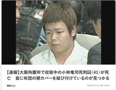 1: 名無し 2026/01/31(土) 17:09:32.67 ID:PR/d+pYi9 【速報】大阪拘置所で収容中の小林竜司死刑囚(41)が死亡 首に布団の襟カバーを結び付けているのが見つかる…