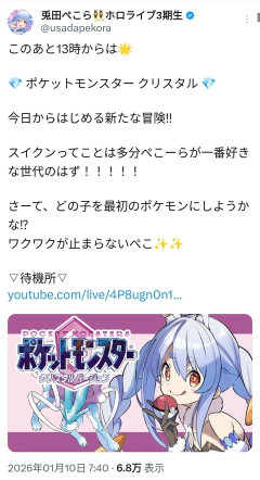 【画像】兎田ぺこらさん、ポケモン配信復活wwwwwww(っ'ヮ'c)オハペコオオオオオオオオオ2日目行ってきます!!!!!☀️#きゅるるん大作戦DAY2 pic.twitter.com/s0PP9l9M4W— 兎田ぺこら👯♀️ホロライブ3期生 (@usadapekora) January 17, 2026 -Vtuberタグ-ホロライブ RSSホロライブ さくらみこ 兎田ぺこら 宝鐘マリン 戌神ころね 星街すいせい 白上フブキ今日のNEW(0゚・∀・)+ ワクテカ +1: 名無しの時事ネタ 2026/01/10(土) 09:26:02.114 ID:nqYPtBtg0…