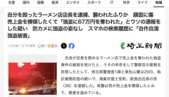 1 : 自身が店長を務めるラーメン店で売上金を奪われた強盗事件の被害を受けたと、うその申告をして警察官の業務を妨害したとして、埼玉県警捜査1課と東松山署は29日、偽計業務妨害の疑いで、鴻巣市富士見町、飲食店店長の男(36)を逮捕した。 逮捕容疑は昨年10月23日午後9時40分ごろ、「刃物で脅されて現金を奪われた」と虚偽の110番をして、警察官の業務を妨害した疑い。「売り上げを横領するため」などと容疑を認め、売上金はパチンコや生活費として使ったとも供述しているという。 男は滑川町羽尾の「熊本ラーメン育元滑川本店」の店長で、売上金の管理などを担っていた。営業を終えた後に店舗の外に出たところ、何者かに殴られ現金約67万円を奪われる被害に遭ったと申告していた。 男のスマートフォンを解析したところ、「自作自演強盗被害」などと検索していたことが分かり、犯行が浮上した。殴られた際にできた顔面の傷は「自分で殴った」などと供述しているという。 全文はソースで…