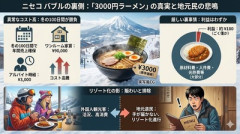 1: 名無し 2026/01/31(土) 21:17:42.55 ID:nI5k0Econ0 北海道ニセコ町では、冬のシーズンにラーメンや焼きそばが3000円で提供されるなど「ニセコ価格」が定着しています。この高価格の背景には、冬の約100日間で1年分の売上を確保しなければならない特殊な事情があります。また、東京並みの家賃や時給2000円から3000円という高い人件費など、圧倒的なコスト高が経営を圧迫しており、高額なメニューでも利益は限定的である実態が浮き彫りとなっています。 Yahoo!ニュース(HBCニュース北海道) ■要約 ・ラーメンや焼きそばが3000円という価格設定が冬のニセコの標準に ・冬の100日間で年間売上を稼ぎ出す必要があるため価格を上げざるを得ない ・ワンルームの家賃が9万円でアルバイト時給も3000円に達する異常なコスト高 ・3000円のカツカレーでも利益が180円程度に留まる厳しい裏事情 ・外国人観光客で賑わう一方で地元道民には手が届かないリゾート化が進行 ハッブル宇宙望遠鏡の画像アーカイブ1億枚をAIがわずか2.5日で解析して異常天体1300個超が確... 【福岡】グエン容疑者ら2人を逮捕 不用品回収2万円のはずが22万円を請求 【速報】マイナンバーカード、物理攻撃に屈する!!! 6億円詐取のプロ集団が使った偽造テクがヤバす...…