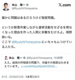 1. 匿名@ガールズちゃんねる 「しかも悪手だったのが29日朝、米山氏のXに、批判者を『視野狭い』『いちゃもん』と非難する擁護投稿がなされたのです。第三者を装った内容でしたが、本人アカウントからの発信だったため“自演による誤爆”との見方が拡散。同日昼、Xでは『ボランティアスタッフによる誤投稿だった』と謝罪しています」 「さらにこの事態を知ってか知らずか新潟県警は同29日、交通部のX公式アカウントで《県道路交通法施行細則では、「みだりに道路に雪をまき、捨てること」は禁止されています》と投稿するなど、警察も巻き込んでの一大騒動になっています」 ・関連トピ 2026/01/31(土) 13:40:06…